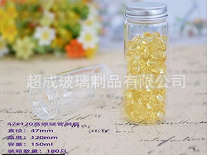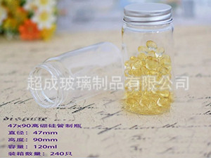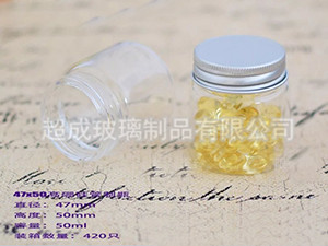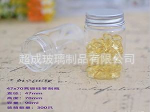 此款規(guī)格為直徑44mm,口徑40mm,高度89mm,容量70ml。原材料采用優(yōu)質(zhì)高硼硅玻璃,制作工藝為管制??畈A恐饕糜诟邫n保健品,蟲草含片,瑪咖精片,鹿茸膠囊,參茸,山參片,蟲草粉,蜂膠,魚油,燕窩,海參等高檔奢飾品。